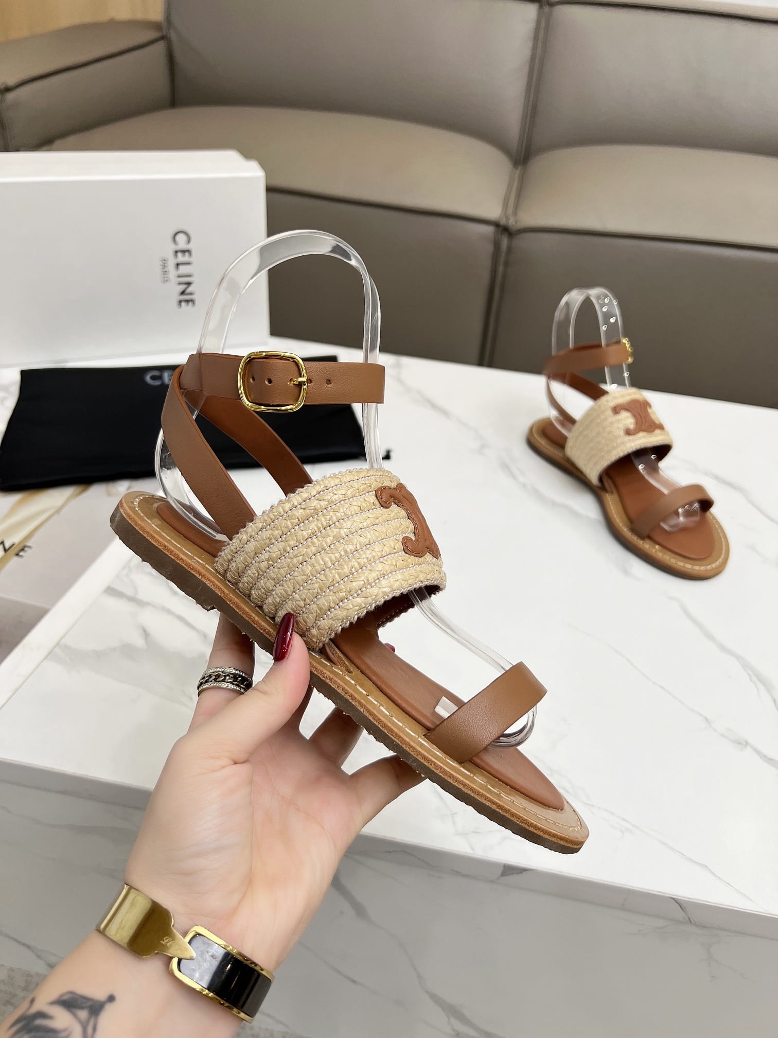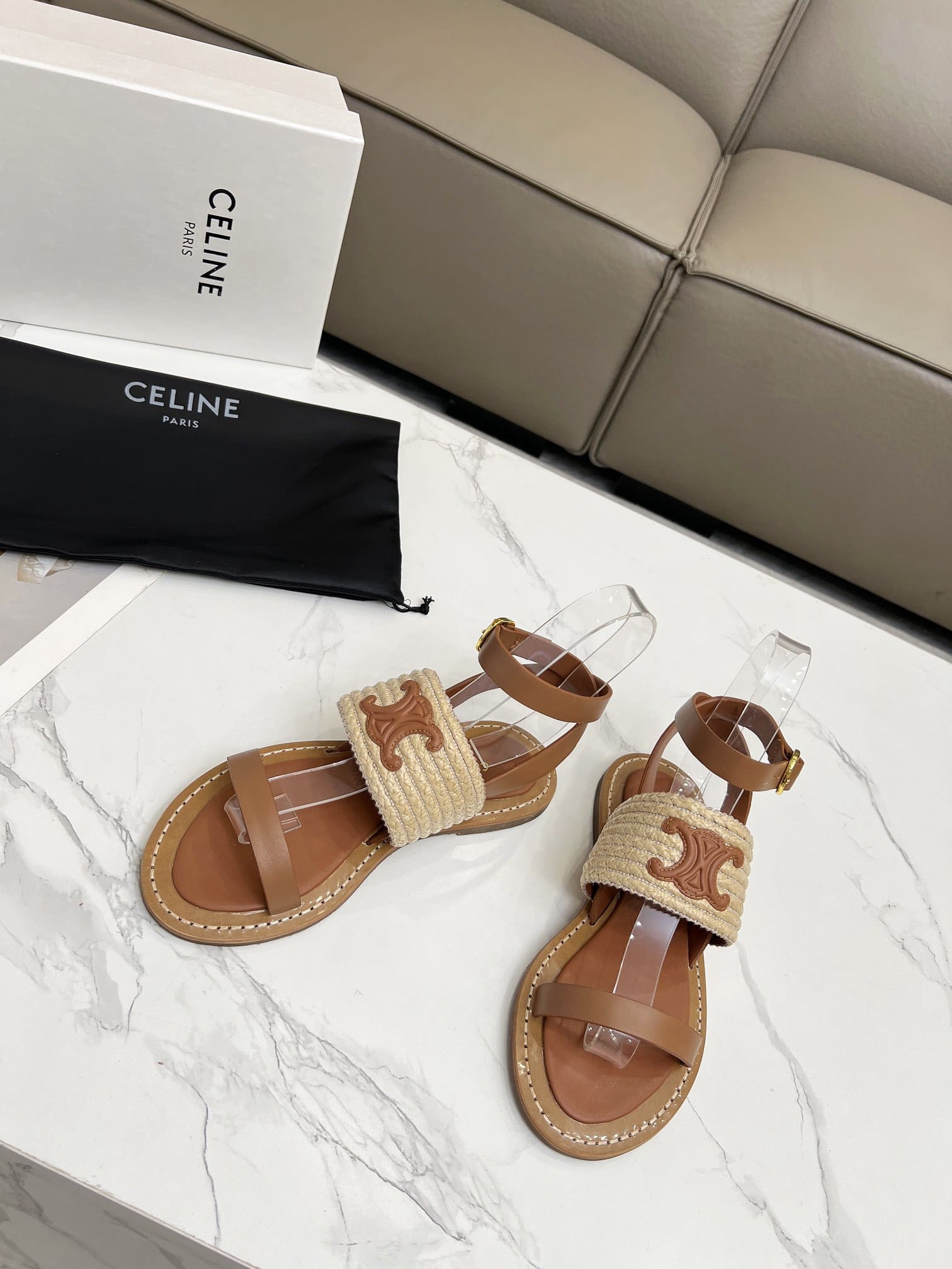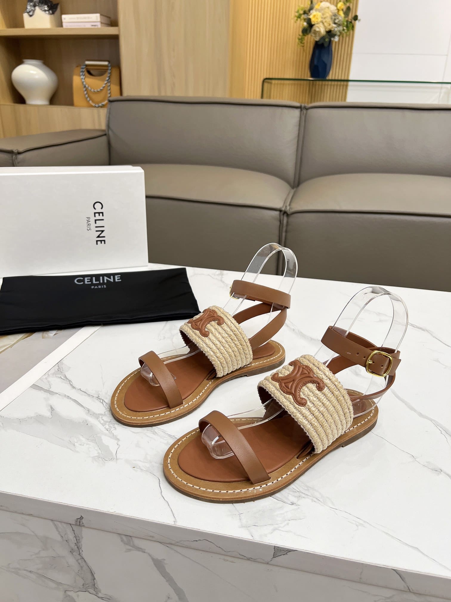 Celine Lympia Flat Strap Sandal In Raffia Brown 352392246Cc02Et