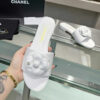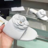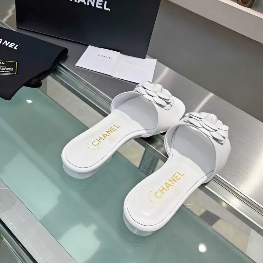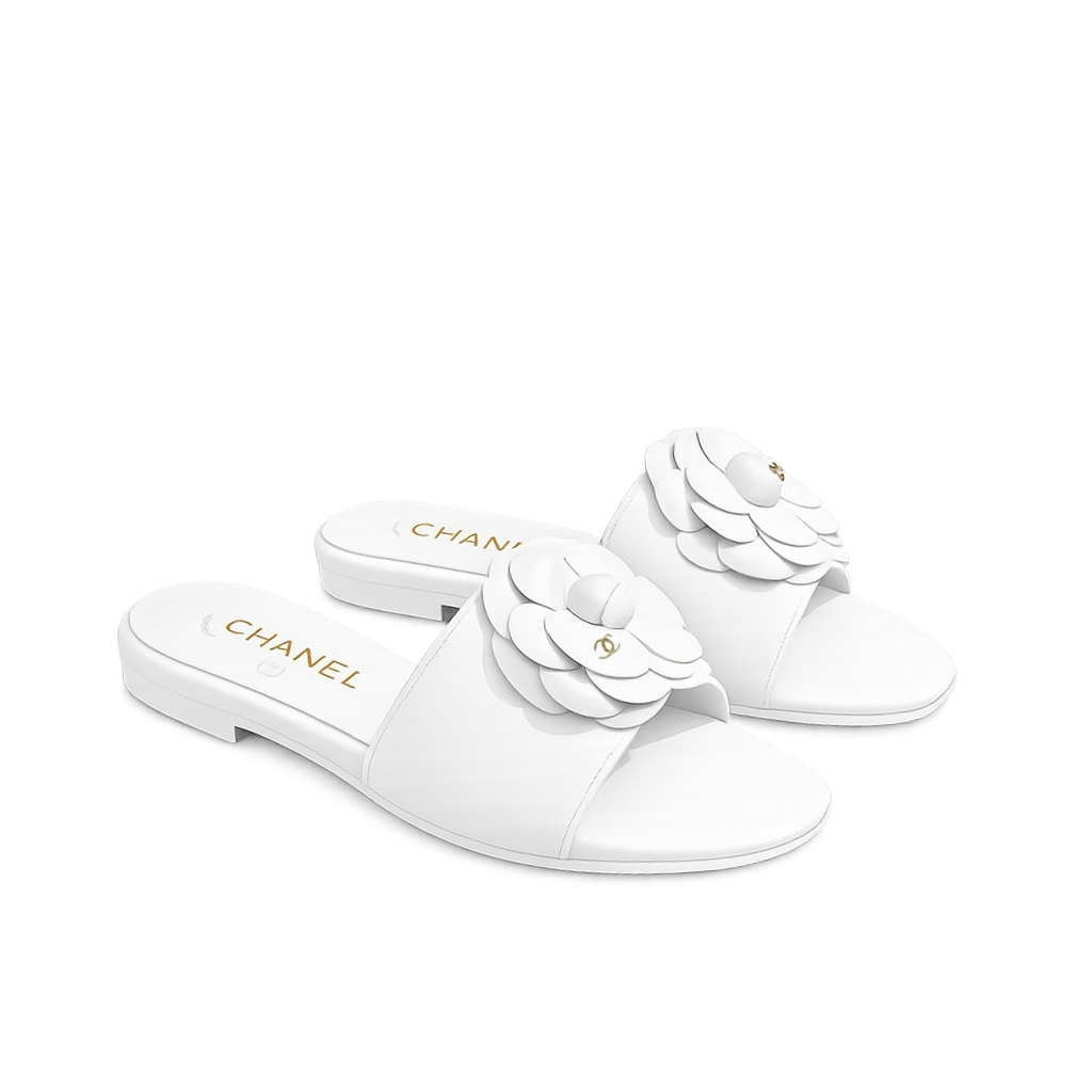 - A feminine and elegant take on everyday comfort. These slides are crafted in smooth white leather, highlighted by the iconic Camellia flower detail with subtle CC accents, bringing a soft, signature Chanel touch.