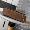 The Chanel Classic Medium Double Flap Bag in dark brown suede, featuring a signature quilted design. It is equipped with gold-tone hardware, including the iconic CC turn-lock closure and a chain strap for versatile wear. Measuring 25cm, this timeless bag offers both luxury and practicality, making it a perfect choice for both formal and casual occasions.
