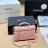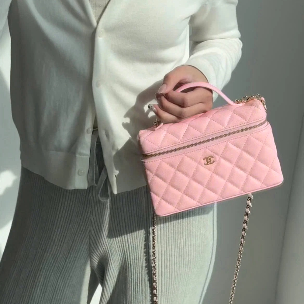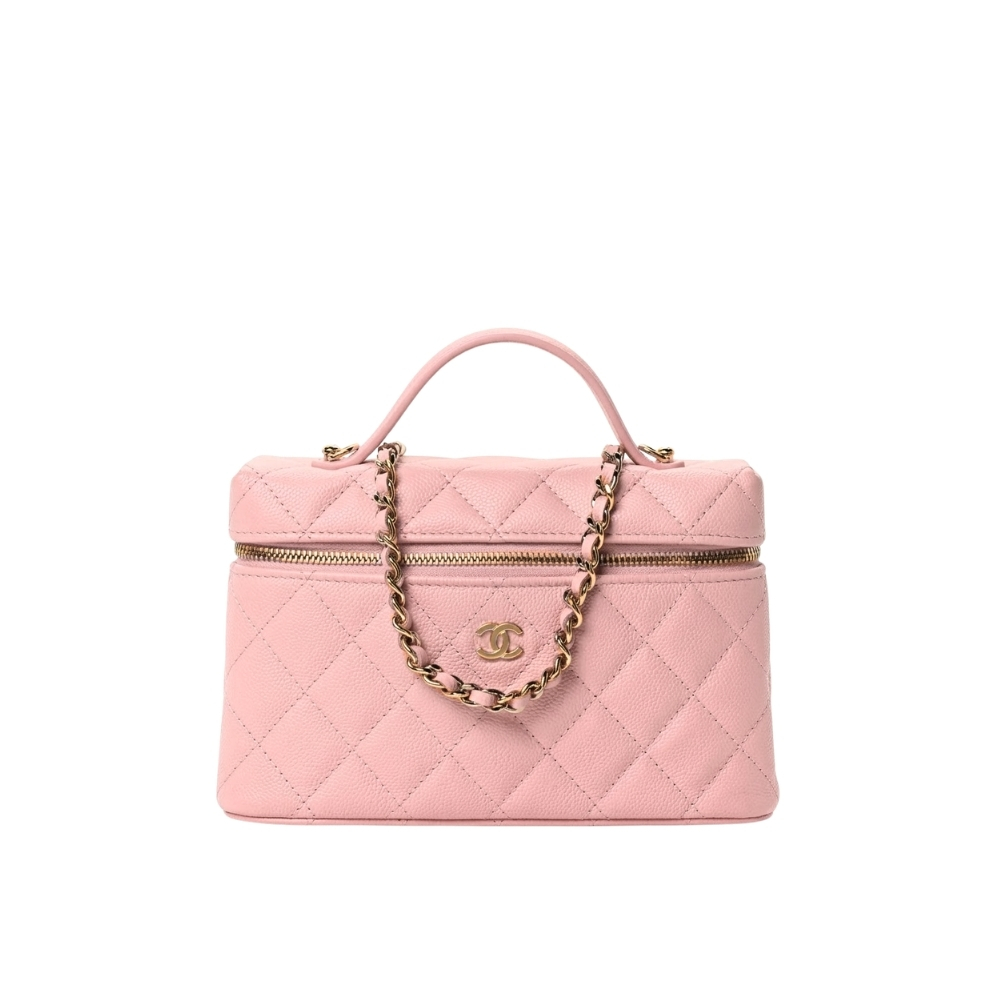 Chanel Classic Vanity With Chain / Leather / Pink / 7.7 x 6.7 inches / Gold-toned hardware / Fits smartphone, cardholder, and lipstick / Luxury top handle bag