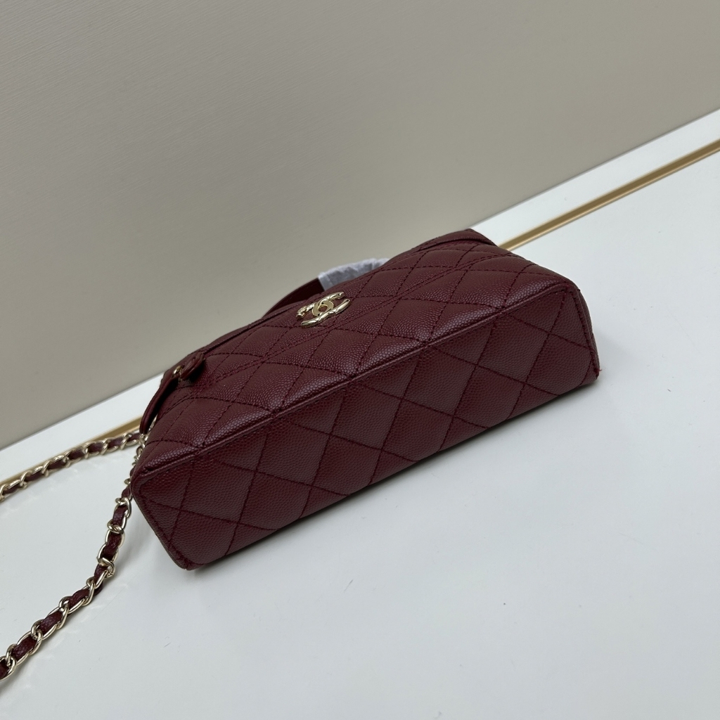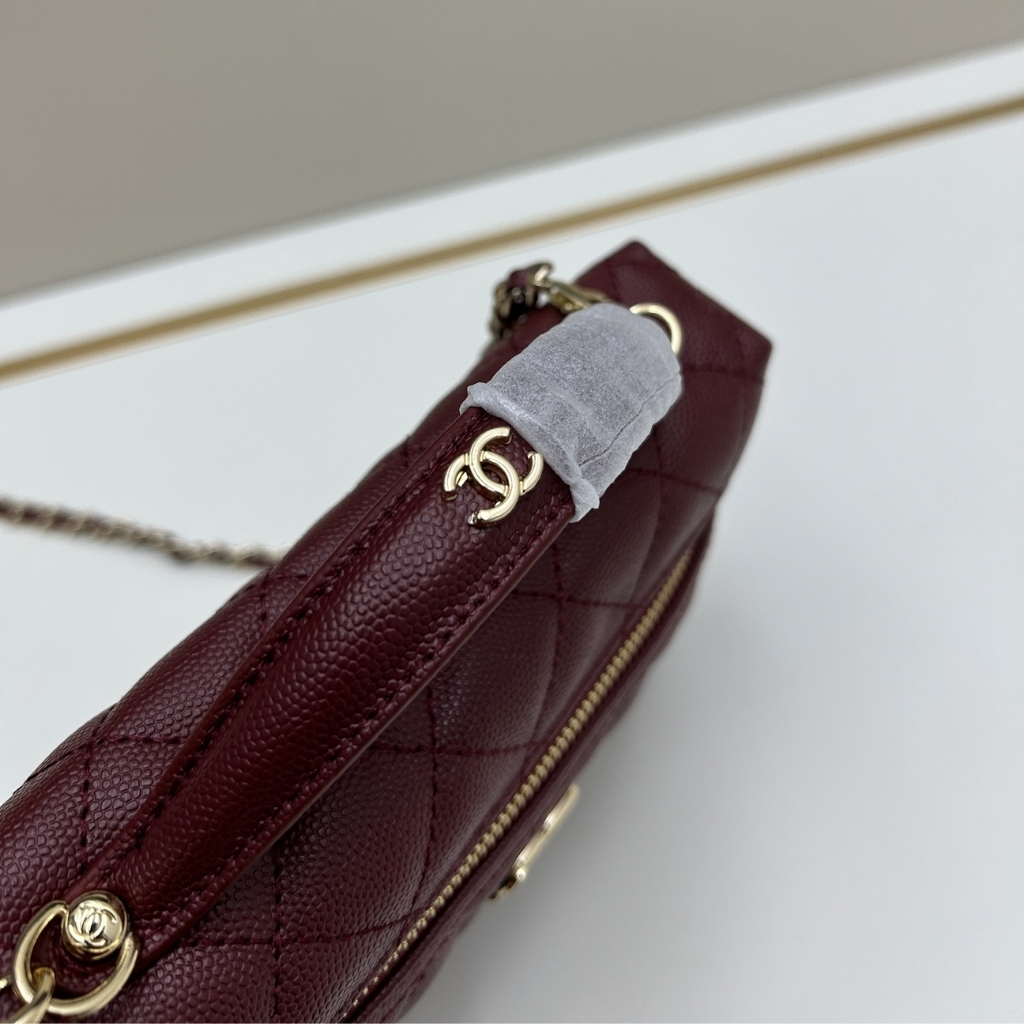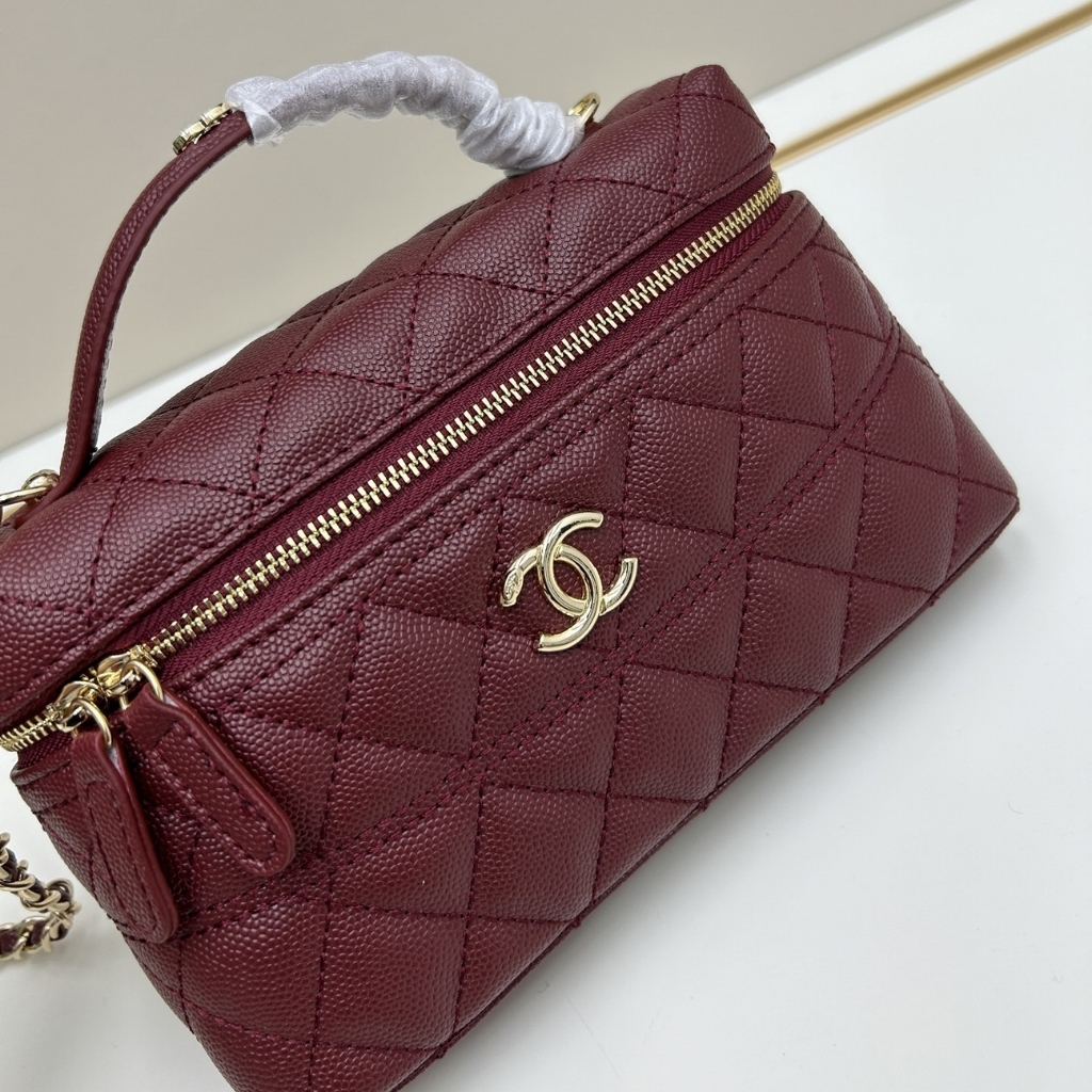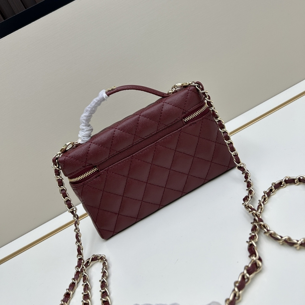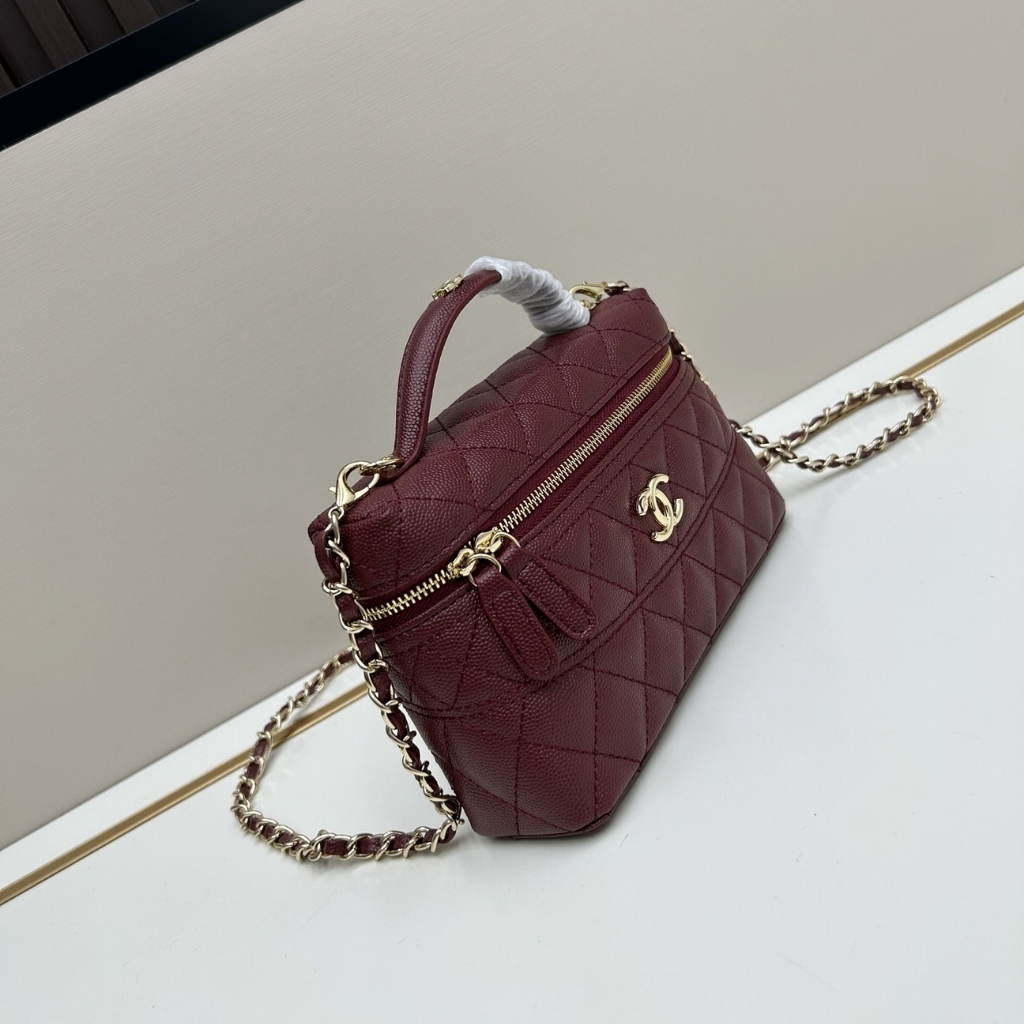 The features the signature diamond quilting and a structured vanity-case silhouette, accented with the iconic CC logo on the front. The design includes a top handle, a zip-around closure, and a chain shoulder strap for versatile carrying. With its compact 19cm size, this elegant piece is perfect for daily outings, travel, or adding a stylish touch to casual and chic looks.