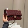 The Chanel Medium Classic Double Flap Bag in burgundy patent leather is a timeless icon of elegance. Its glossy finish enhances the signature quilting, while the gold-tone CC turn-lock and chain-link shoulder strap add a luxurious touch. Featuring a structured double-flap design for extra security and organization, this bag is a perfect blend of style and function, ideal for any occasion.