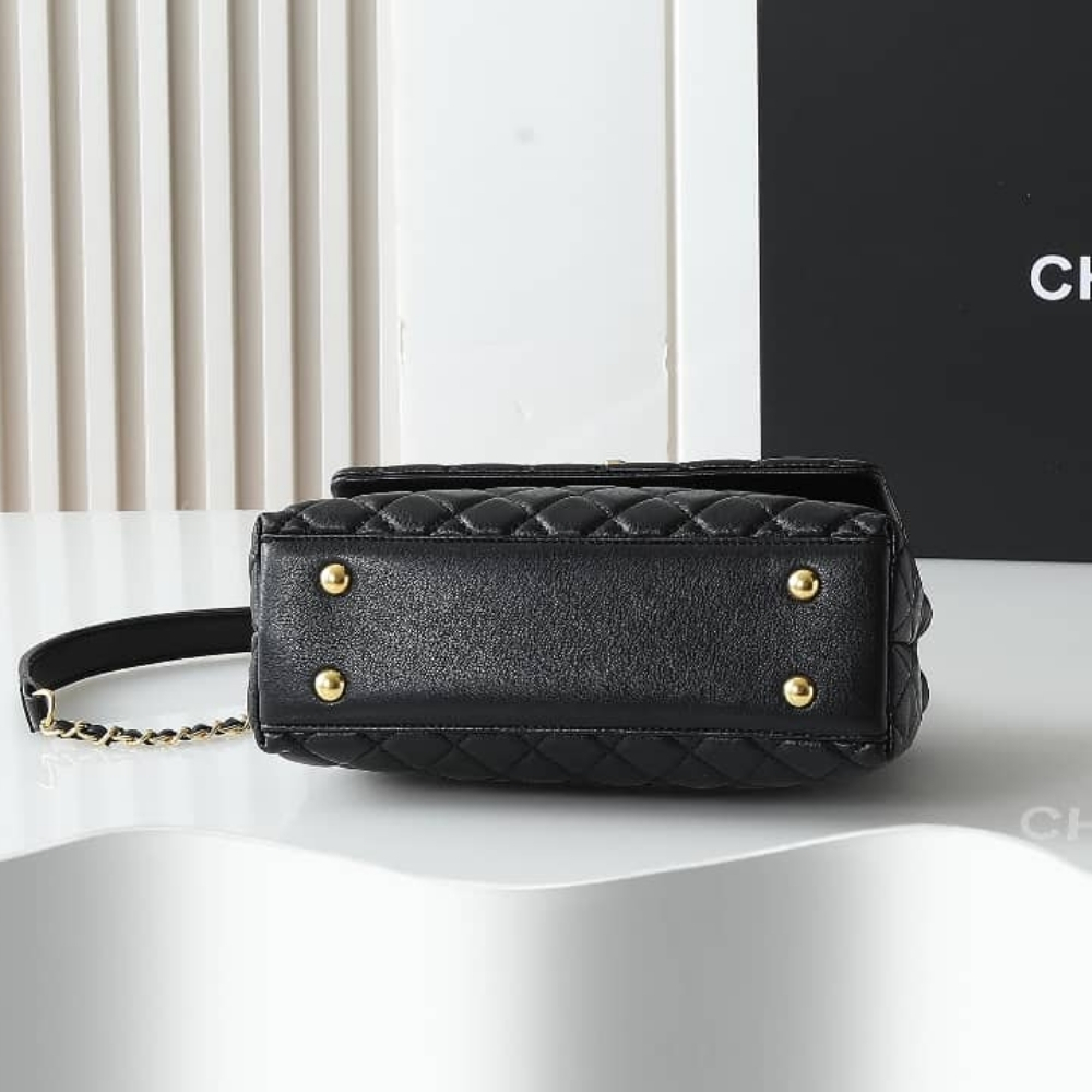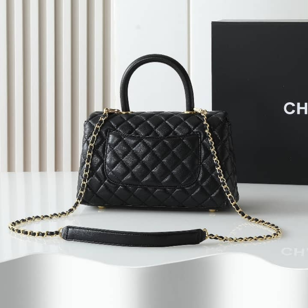 The Chanel Medium Coco Handle Bag in black featuring a structured trapezoidal shape. It is designed with a sturdy rolled top handle and a detachable interlaced chain-and-leather strap, allowing for elegant hand, shoulder, or crossbody carry. Finished with the timeless gold-tone CC turn-lock and a well-organized interior, this bag remains a highly coveted piece that perfectly balances classic heritage with modern functionality.