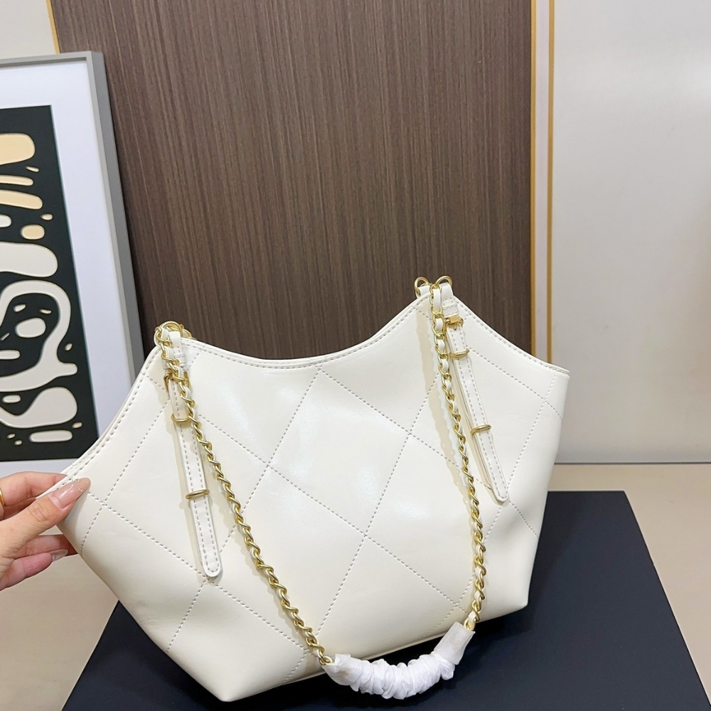 The Chanel Shopping Bag in white is a sophisticated and compact accessory that offers a fresh, modern take on a classic tote. Expertly crafted from smooth leather, this model features the Maison’s signature large-scale diamond quilting and radiant gold-tone metal hardware. The design is highlighted by the iconic interlocking CC logo and versatile leather-interlaced chain straps, making it an elegant choice for both day and evening wear.
