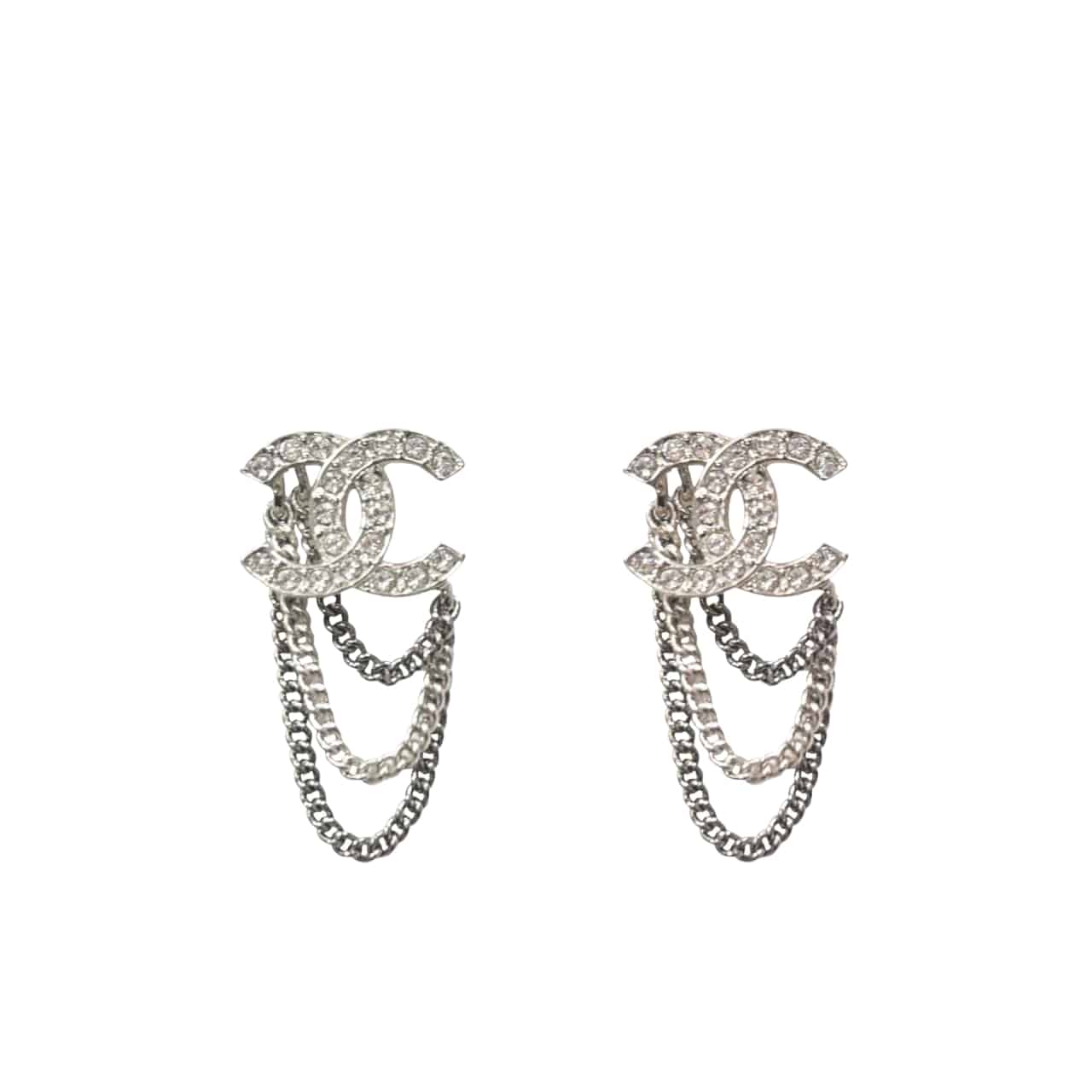 Chanel Stud Earrings With Crystal And Multi Chain In Silver Tone