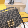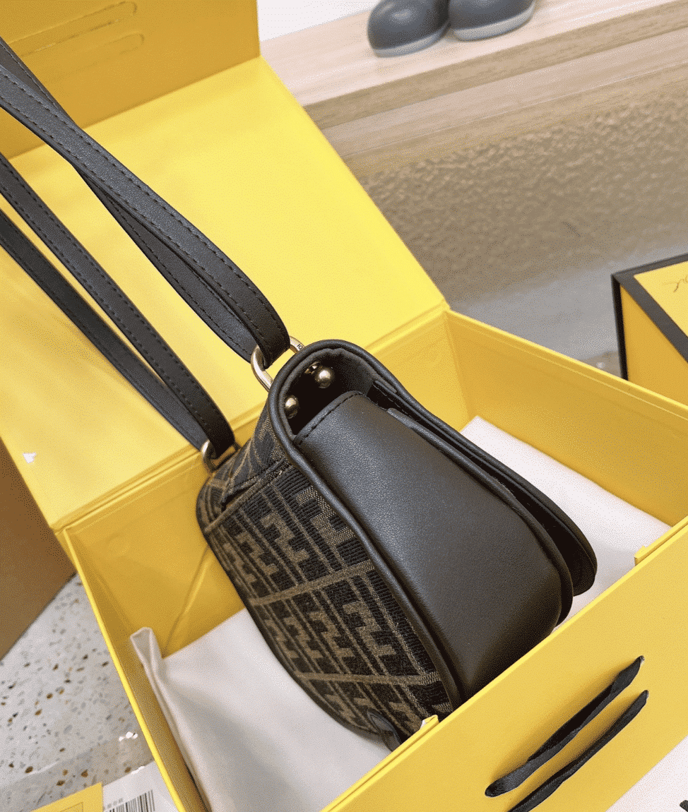 - Embellished with embossed details and edges in brown leather and an FF logo on the flap.