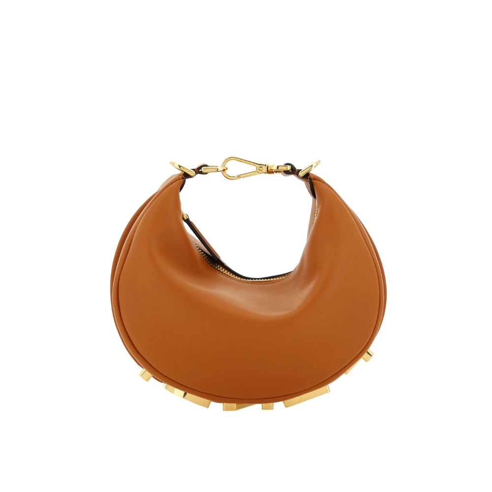The Fendi Fendigraphy Mini Leather Bag in Brown is a chic and modern accessory that combines elegant design with a bold, structured shape. Featuring a distinctive gold-tone hardware detailing at the base, this 20cm bag adds a touch of sophistication to any ensemble. A stylish yet practical piece, perfect for both day and night.