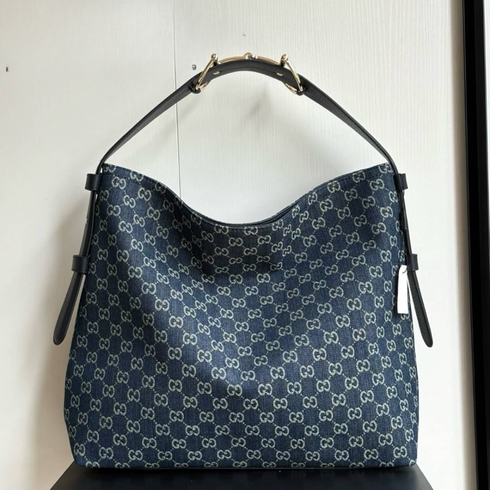 Gucci Beatrix Large Blue And White GG Denim/ 15.7 x 14.2 x 4.7 inches / Horsebit detail / Tote Bag / Gold-tone hardware / Chic Style