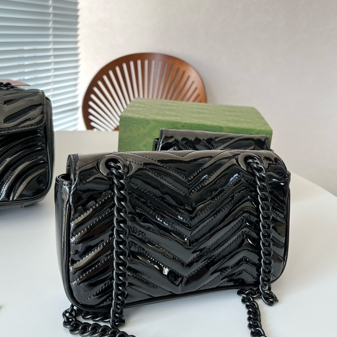Gucci GG Marmont Patent / Mini Bag / Black / Matelassé Leather / 6.7 x 3.9 inches / Crossbody Bag / For Women