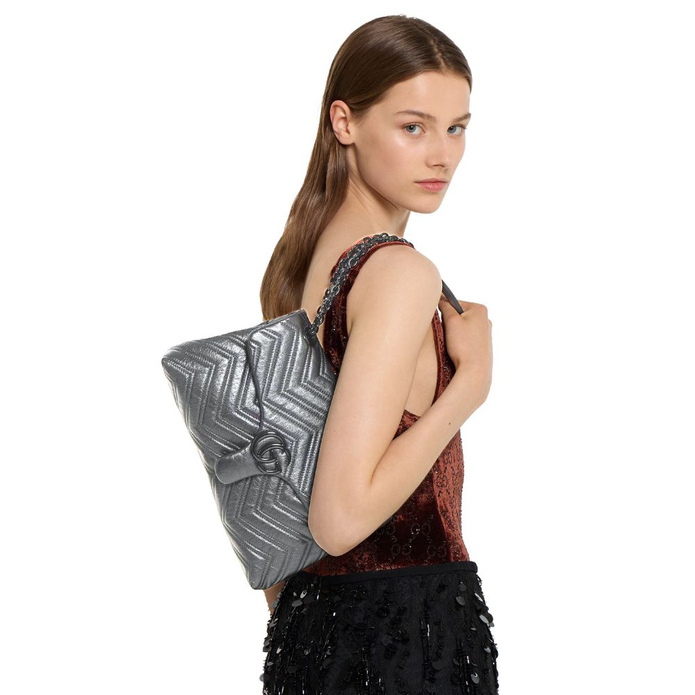 In the Fall Winter 2025 collection, the GG Marmont, a signature collection of the House, features the emblematic Double G, a faceted chain strap, and a soft, structured silhouette. This style is crafted from soft lightweight matelassé chevron leather and comes with a tonal enamelled hardware and chain.