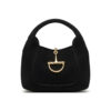 The Gucci Softbit Medium Top Handle Bag in black features a unique, curved hobo-style silhouette accented by the iconic oversized Horsebit hardware in radiant gold-tone metal. The elegant design includes a structured top handle for a comfortable hand carry and a spacious interior to accommodate your daily essentials.