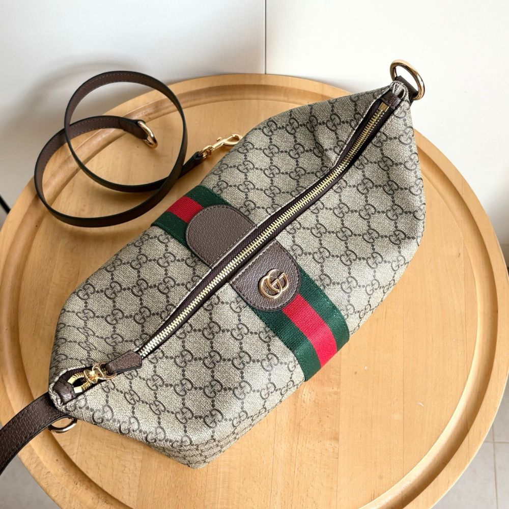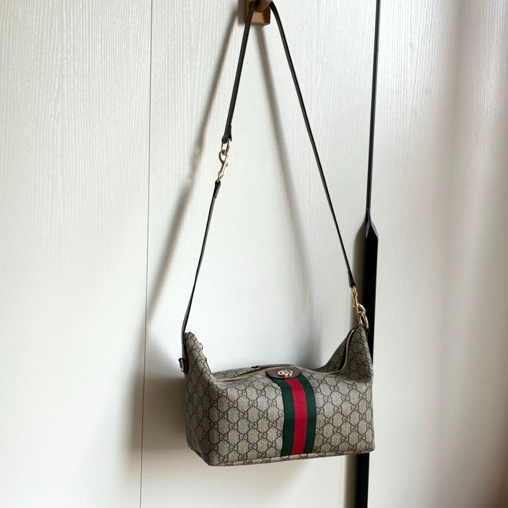 Gucci Vanity transforms inspirations from the classic beauty case into a striking silhouette that can be worn in three different ways. This bag can be carried over the shoulder, or as a top handle with the strap doubled up. It also can be styled as a crossbody bag with an additional strap.