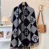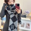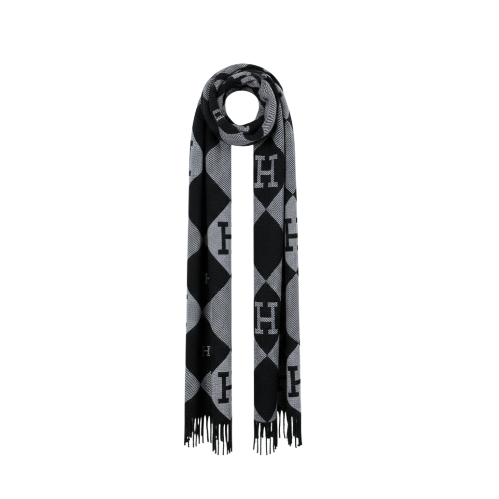 The Hermès Diamond H Logo Wool Shawl in dark navy blue is a luxurious accessory featuring an intricate jacquard-woven diamond motif with contrasting “H” signatures. Crafted from wool and cashmere blend, its generous proportions allow it to be styled elegantly as both a voluminous wrap or a classic muffler. Finished with delicate fringed edges, this timeless piece perfectly combines the Maison’s equestrian heritage with modern geometric design.