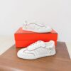 This pair of Hermès white leather sneakers offers a clean, sophisticated look with minimalist detailing. The shoes are crafted from smooth white leather with subtle perforated accents forming the iconic “H” logo on the sides. The fine contrast stitching in warm tan adds a touch of elegance, while the sturdy rubber sole ensures durability and comfort.