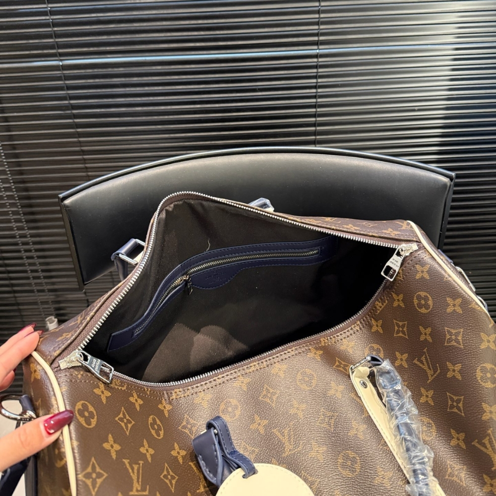 The Louis Vuitton Keepall Bandoulière 50 in Monogram canvas features striking light yellow leather trim and navy blue handles, offering a contemporary and vibrant twist to the house’s legendary travel bag, making it the perfect companion for short trips and weekend getaways.