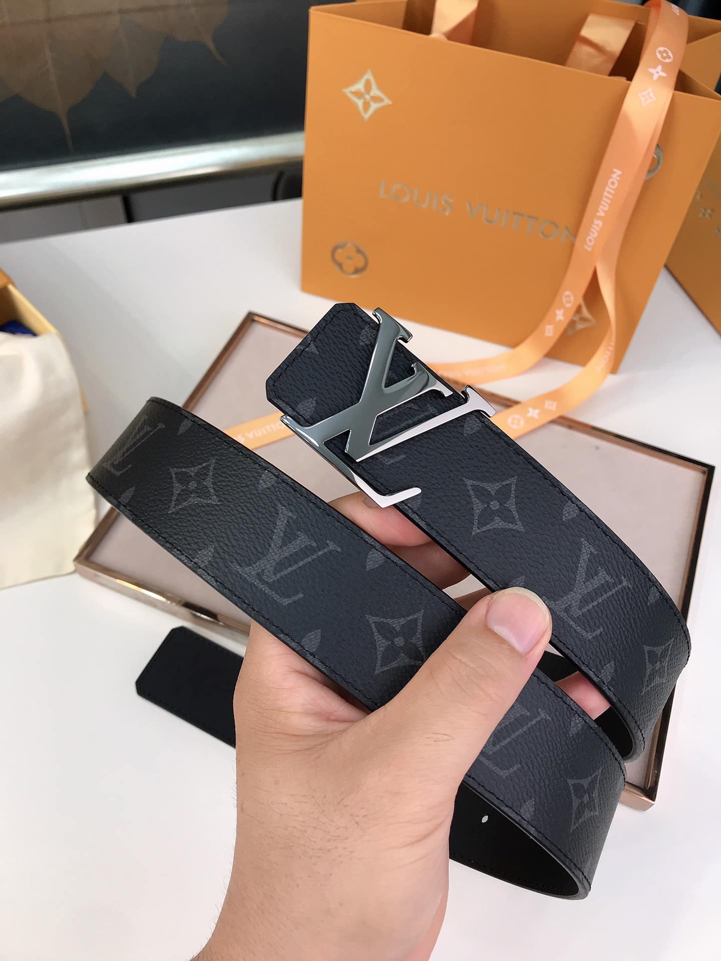 Private: LOUIS VUITTON LV INITIALES REVERSIBLE BELT MONOGRAM ECLIPSE SILVER METAL 4CM