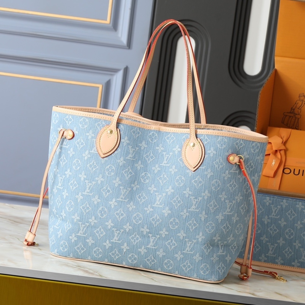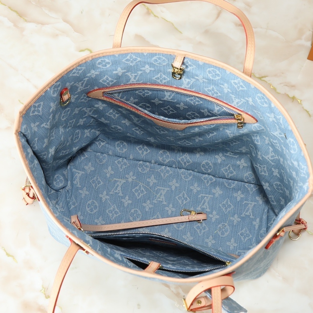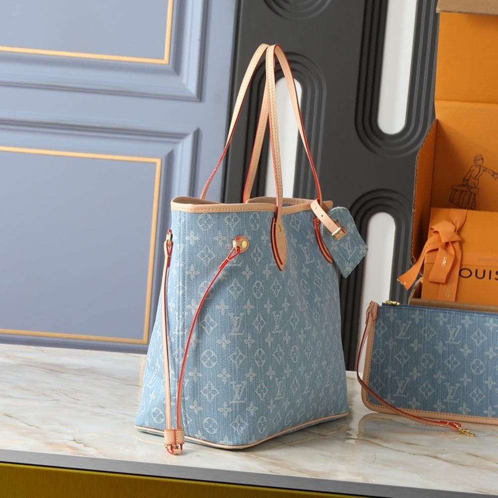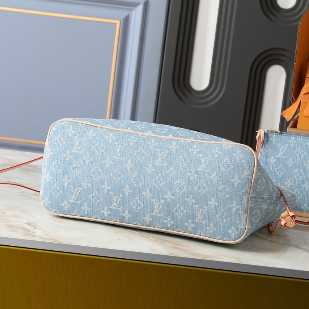 Louis Vuitton Neverfull MM Bag Denim Blue / 12.2 x 11.0 x 5.5 inches / Gold-toned hardware / Fits essential items / Tote Bags