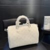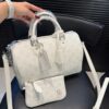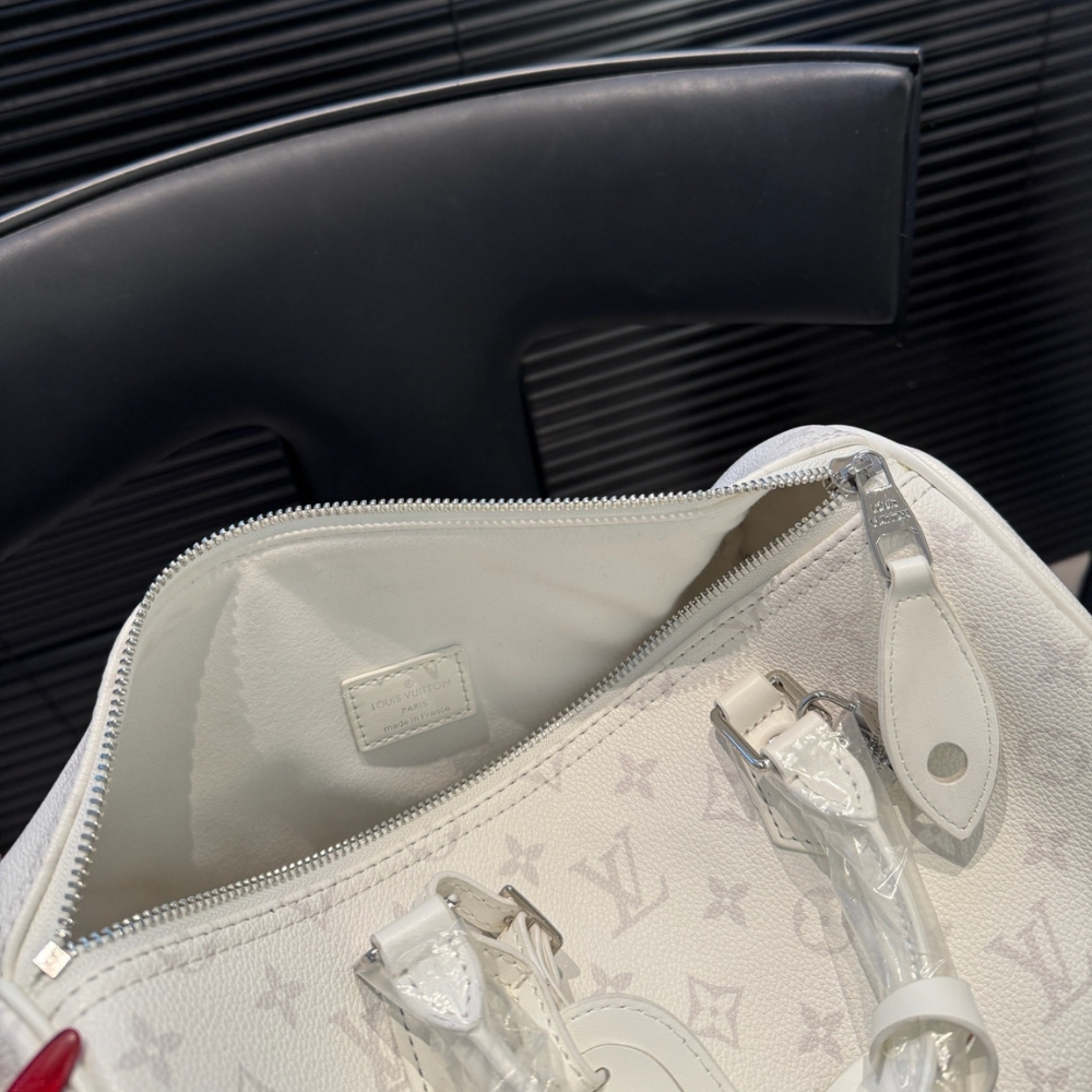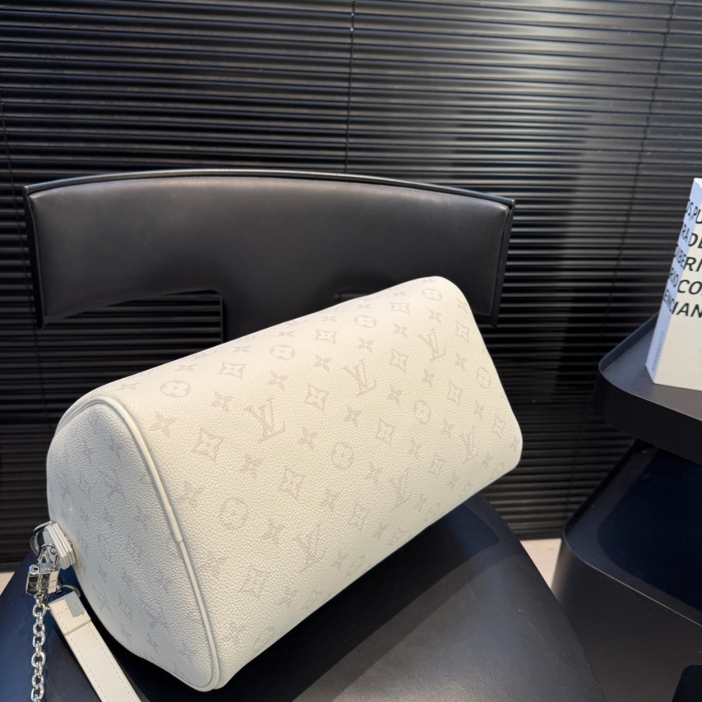 The Louis Vuitton Speedy P9 Bandoulière 30 in white is a luxurious reinterpretation of an archival icon, reimagined by Pharrell Williams in ultra-soft. Adorned with a Monogram print, this exclusive piece features a heritage side lock that reflects the House’s legendary craftsmanship. Designed for modern versatility, it comes equipped with twin top handles, a removable adjustable leather strap, and a matching leather pouch to keep your essentials elegantly organized.