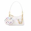 Twisting elegance with edge, the Marellini is crafted from the House’s textured leather in bijou proportions big enough to fit daily essentials, including a large smartphone. Rebellious chunky golden chains secure a round coin purse and a mirror to the outside, both of which strike a playful contrast in the Louis Vuitton x Murakami collection’s multicolored Monogram canvas.