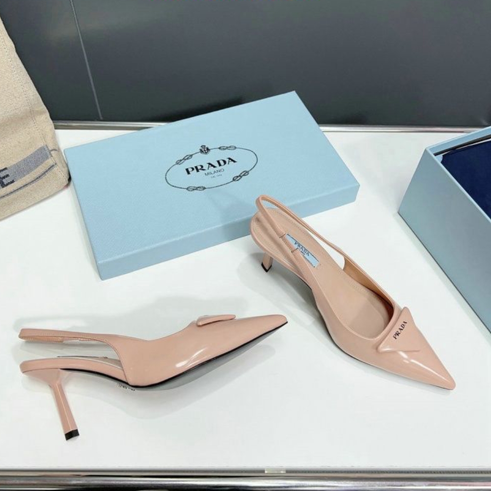 These pumps expressing sophisticated, feminine elegance are made of brushed leather, an emblematic material of Prada since the 90s traditionally used for luxury footwear. The triangle logo returns as a slightly padded leather detail and inspires the geometric line of the heel, which gives the silhouette a modernist note.