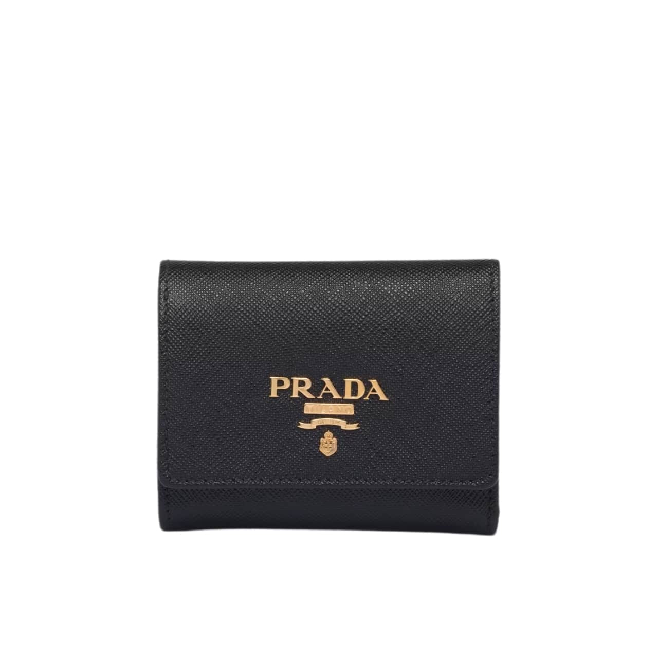This leather wallet with the metal logo on the front flap has a compact, modern design