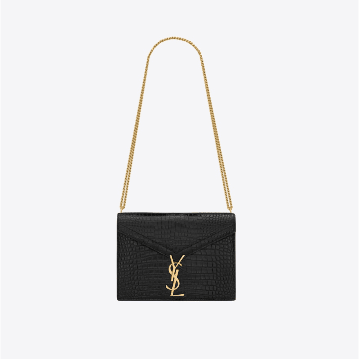 SAINT LAURENT CASSANDRA CROC-EMBOSSED SHINY LEATHER CROSS-BODY BAG BLACK 22CM