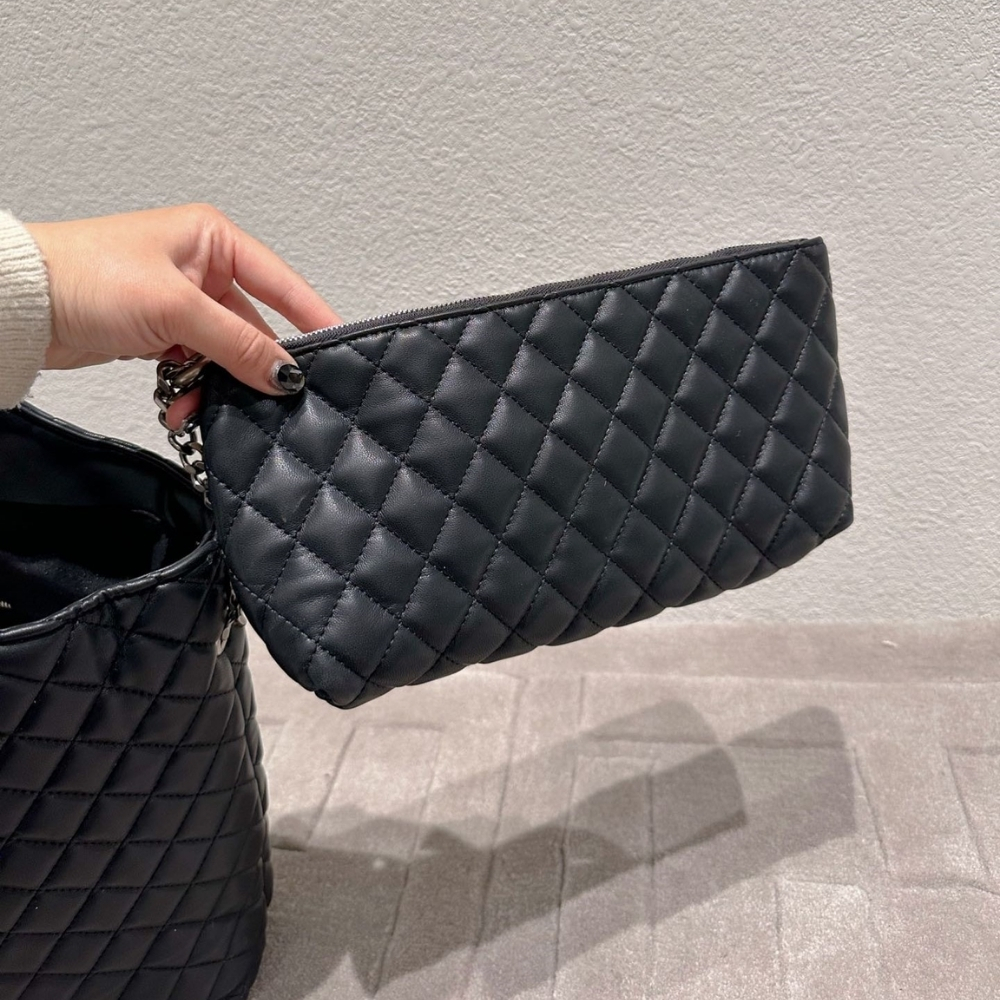 Shopping bag with toggle closure, featuring a removable zipped pouch, decorated with carré-quilted overstitching and the new sculpted jewel CASSANDRE.