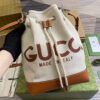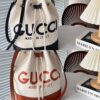 Reversible bucket shoulder bag in beige from Gucci. One side is made of canvas and trimmed with brown calf leather. The other side is made of GG Supreme canvas. The item’s features include a drawstring fastening, silver-tone metal hardware, logo detailing and a detachable shoulder strap.